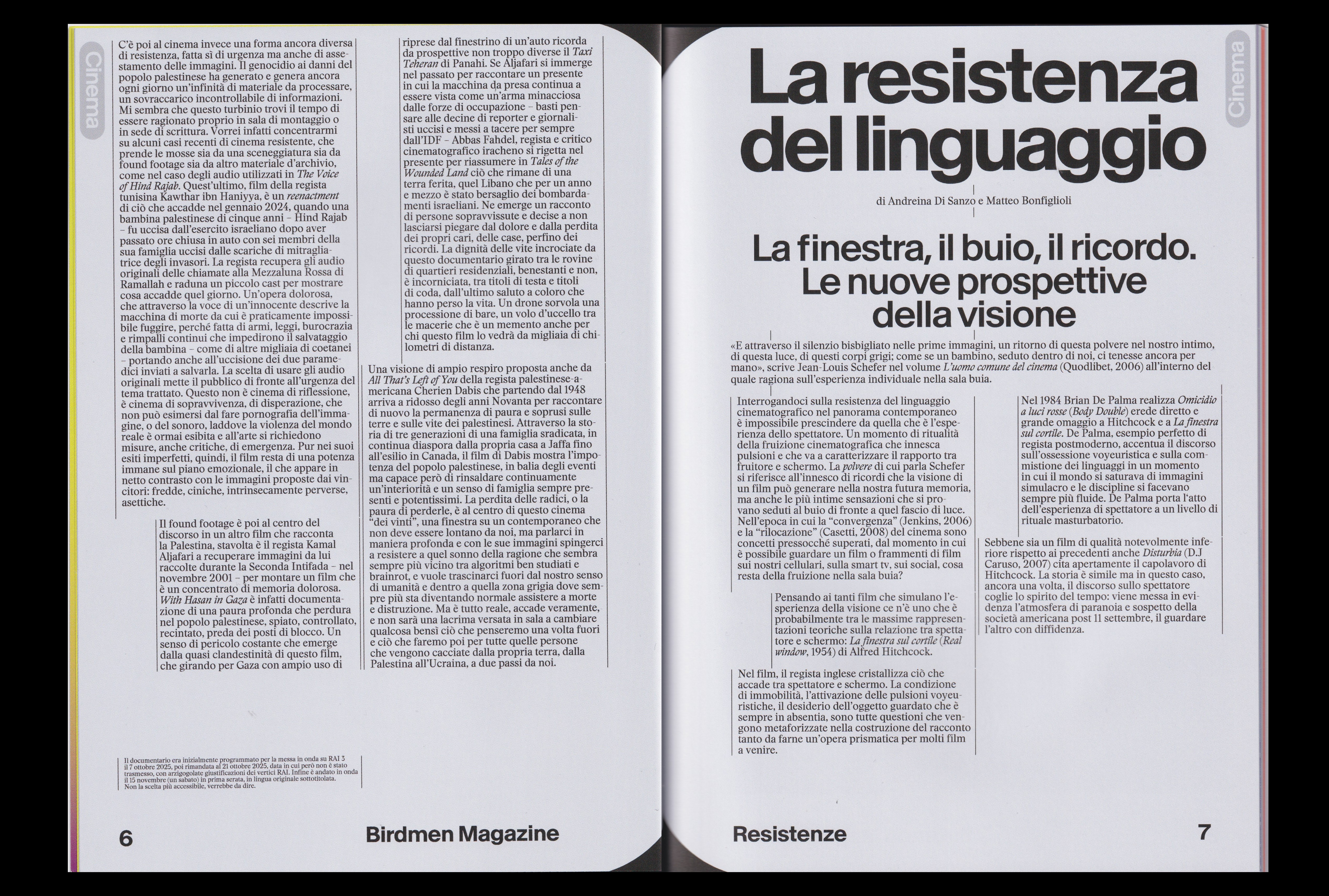 RESISTANCES – Birdmen Magazine, an independent publication founded in 2015 and dedicated to cinema, television series, and theatre, returns with its tenth printed issue, Resistances — a project that explores the concept of resistance in its many forms within contemporary audiovisual culture and beyond. Originally created by students of the University of Pavia and now supported by a nationwide editorial collective, Birdmen translates its critical, passionate, and collaborative gaze into print, examining films, series, and performances that confront conflict, friction, and narrative persistence.